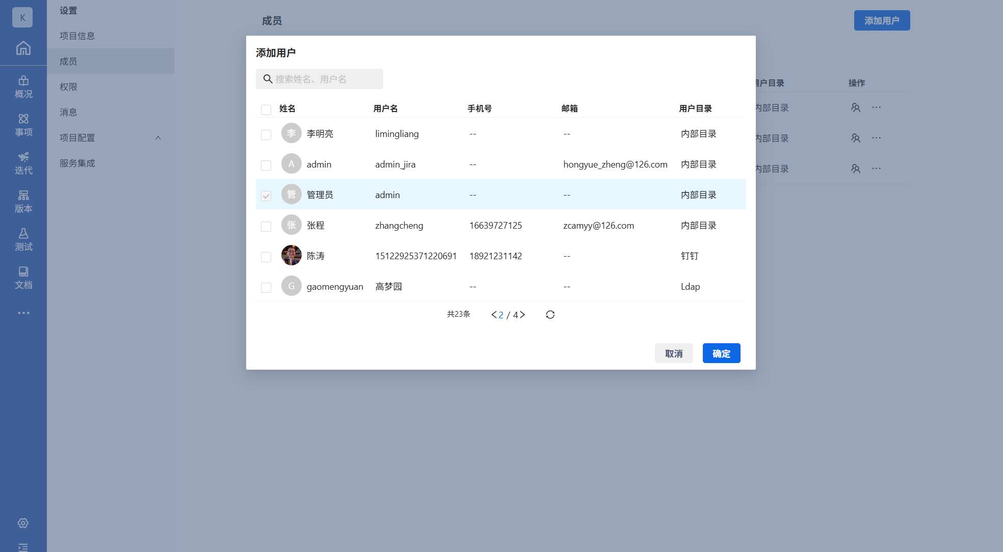 进入项目,依次点击项目设置->成员->添加用户->勾选已经存在的系统用户->确定。项目成员添加成功