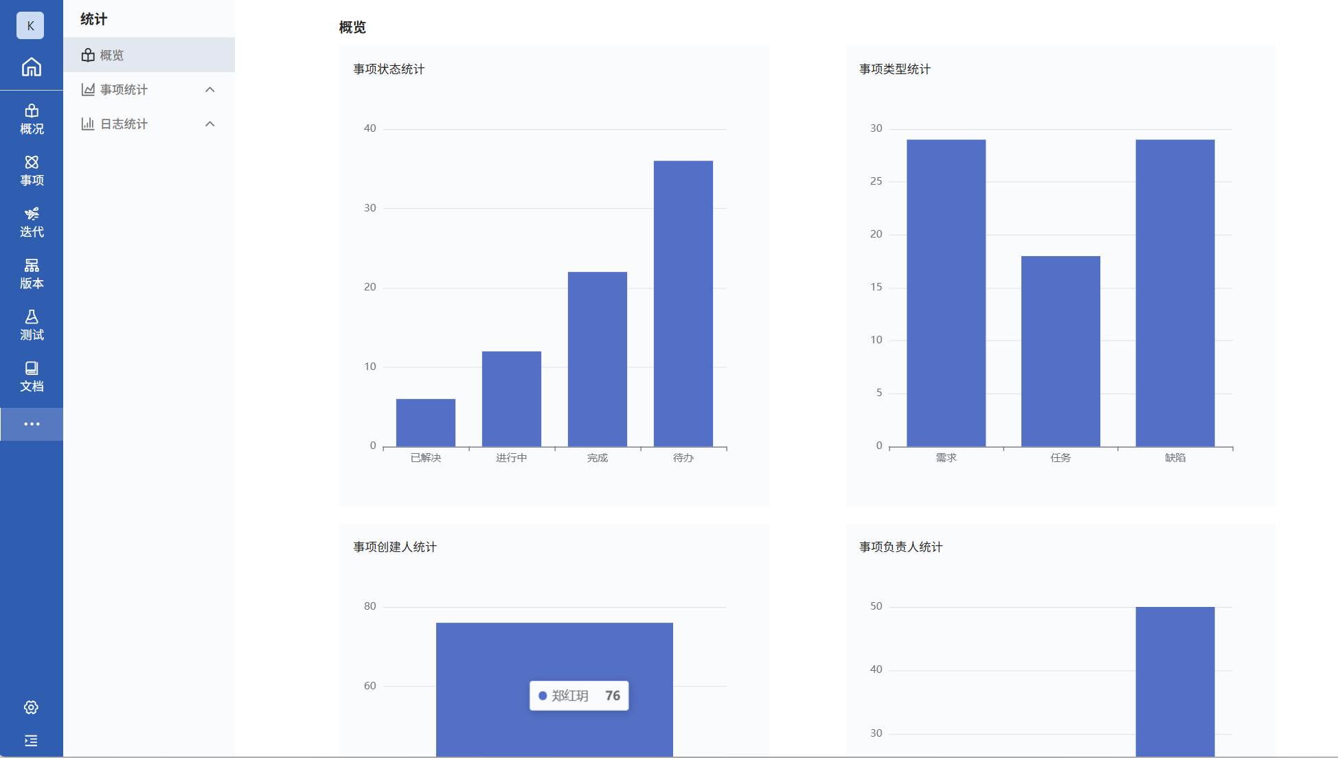 统计:统计页面提供多种表格,从不同维度统计当前迭代数据。