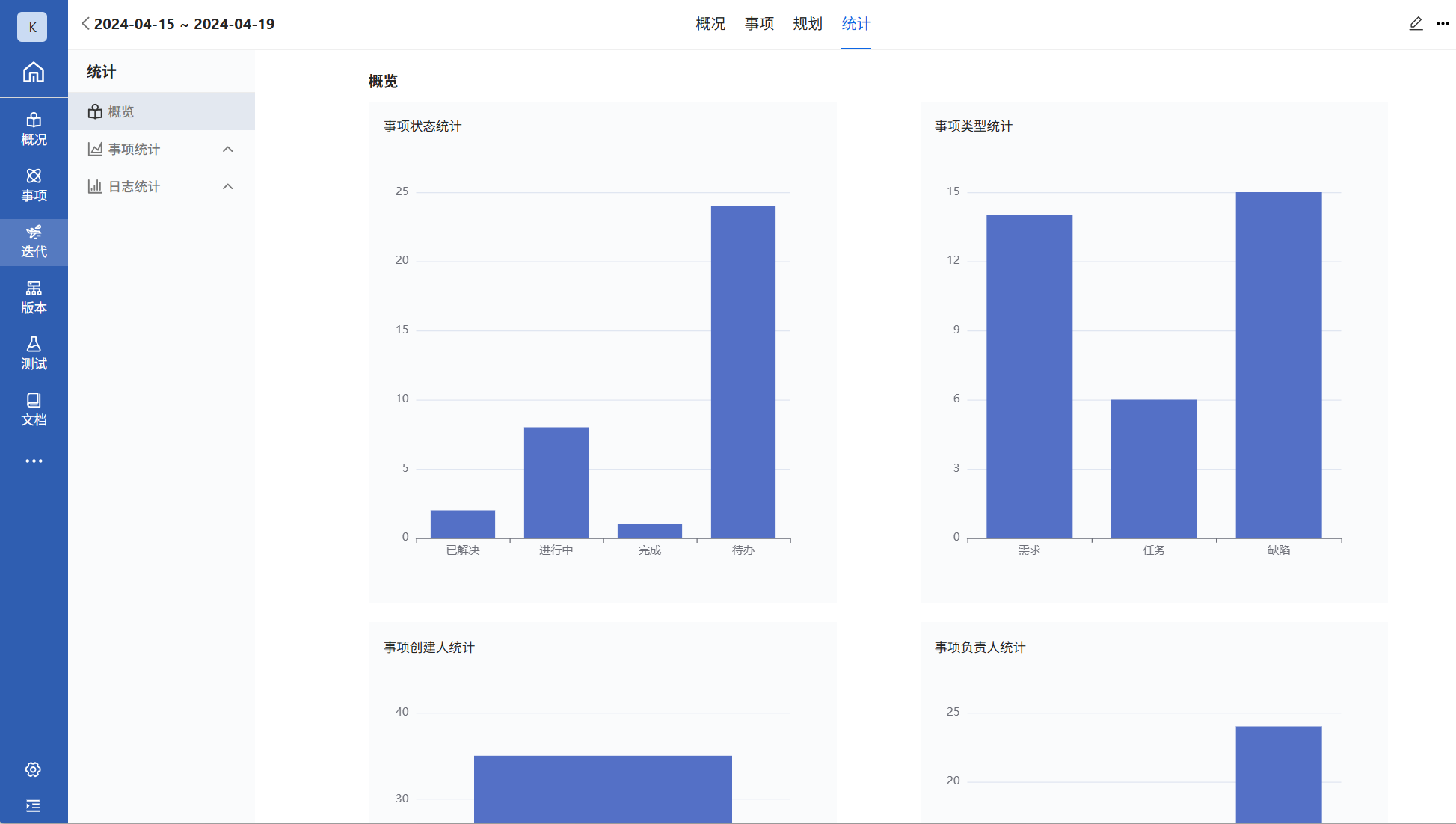 点击迭代名称进入迭代。迭代中含有概况、事项、规划、统计四个页面。