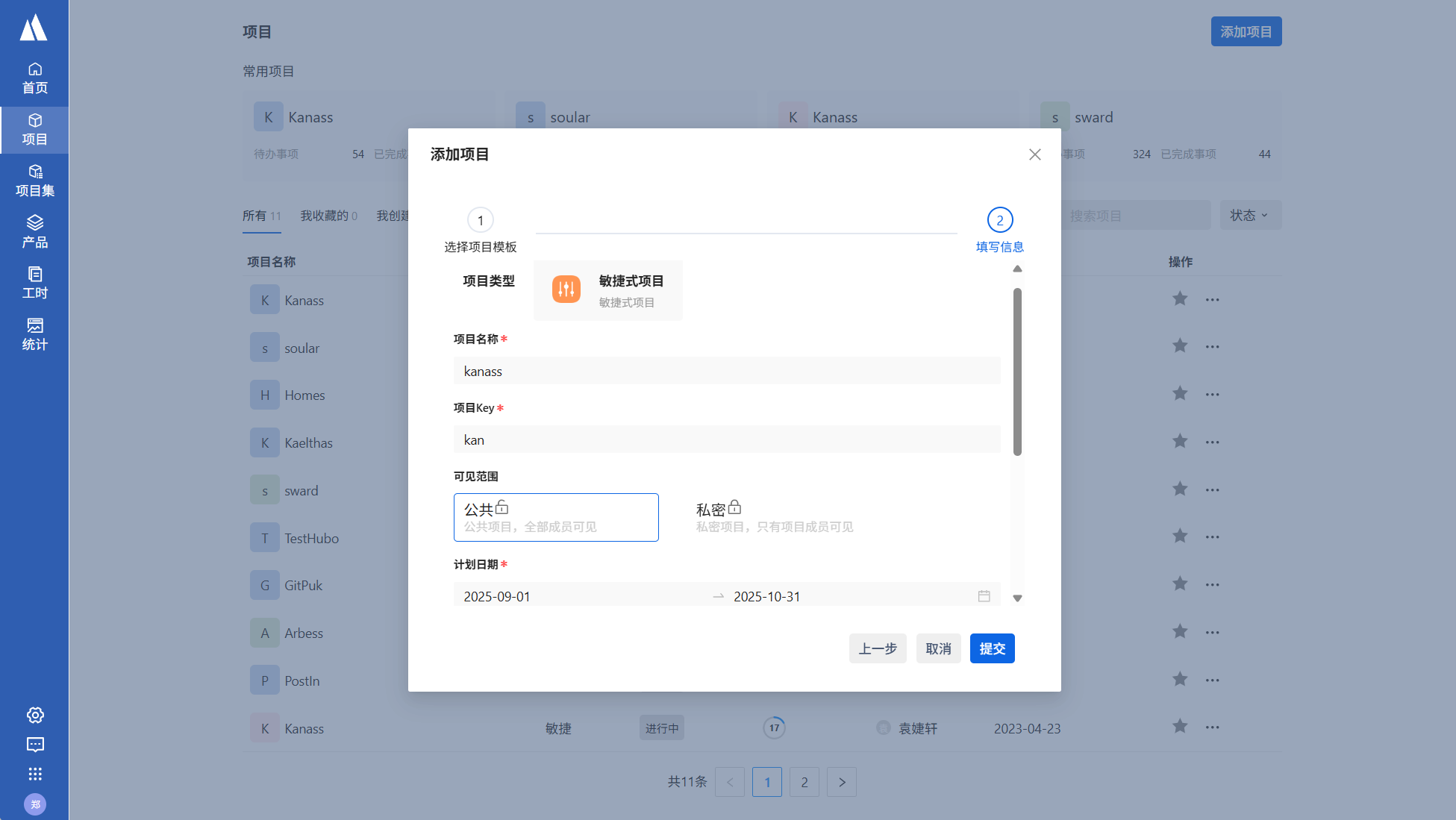 登录kanass,点击项目->添加项目->选择项目模版(敏捷项目)。填写项目名称、项目KEY、计划日期,选择可见范围后点击提交,项目创建成功