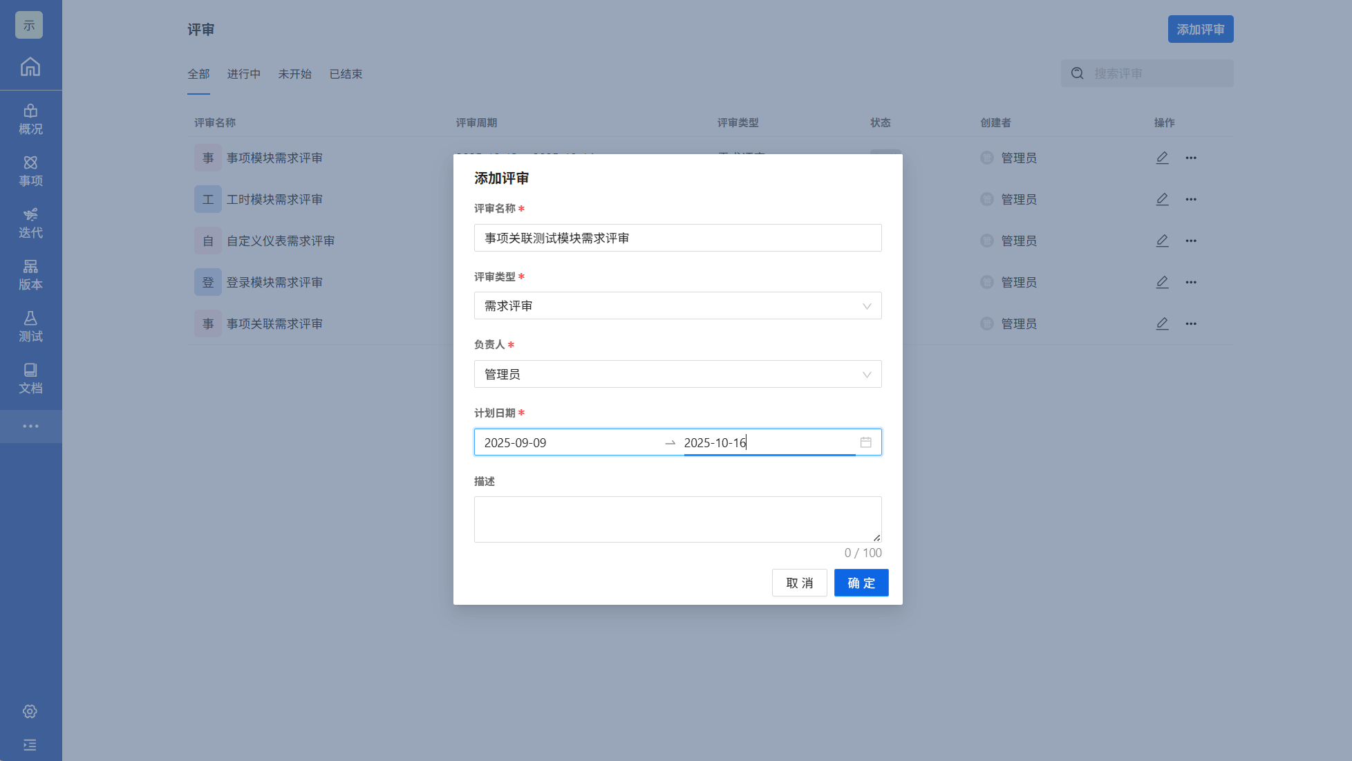 点击项目->导航栏中的更多->评审->添加评审。添加评审页面填写相关信息,并选择评审类型为需求