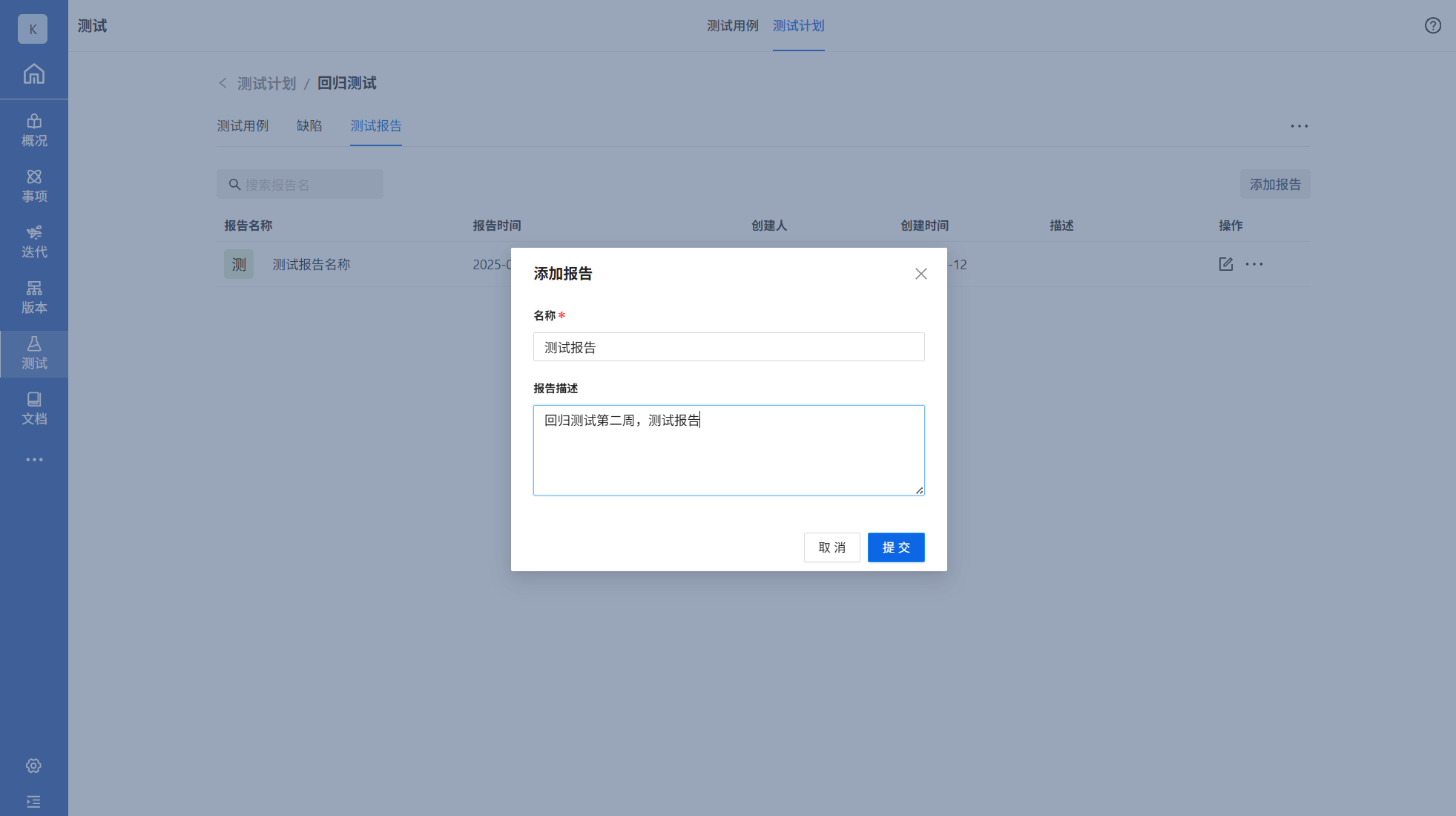 点击测试模块中的测试计划页面,添加测试计划。填写计划名称、测试计划时间等信息后点击提交,测试计划创建成功。