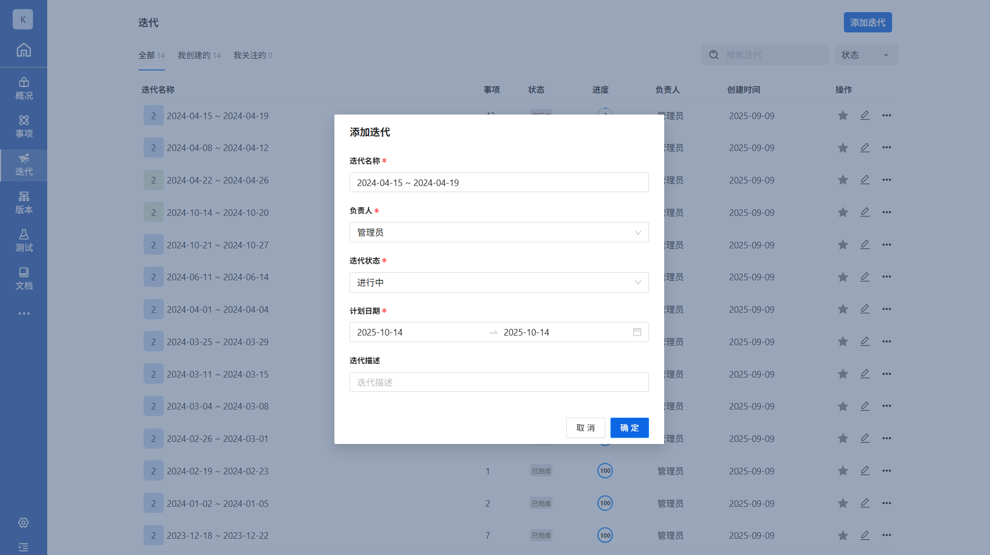 进入迭代模块,点击添加迭代并填写迭代名称、计划日期后点击确定,迭代创建成功。