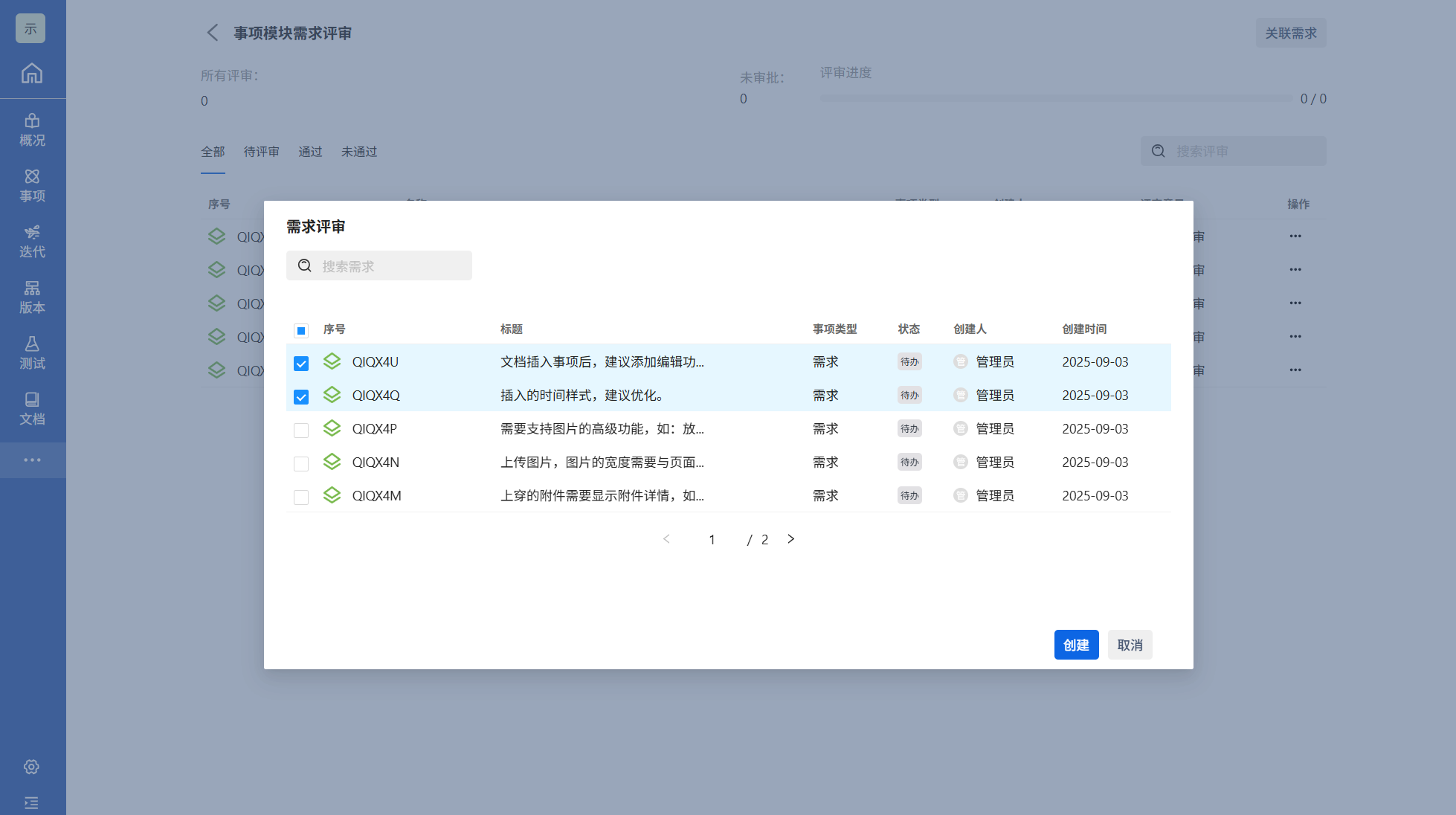 当某一类需求或某个模块的需求创建成功后,就可以在评审模块对其评审。