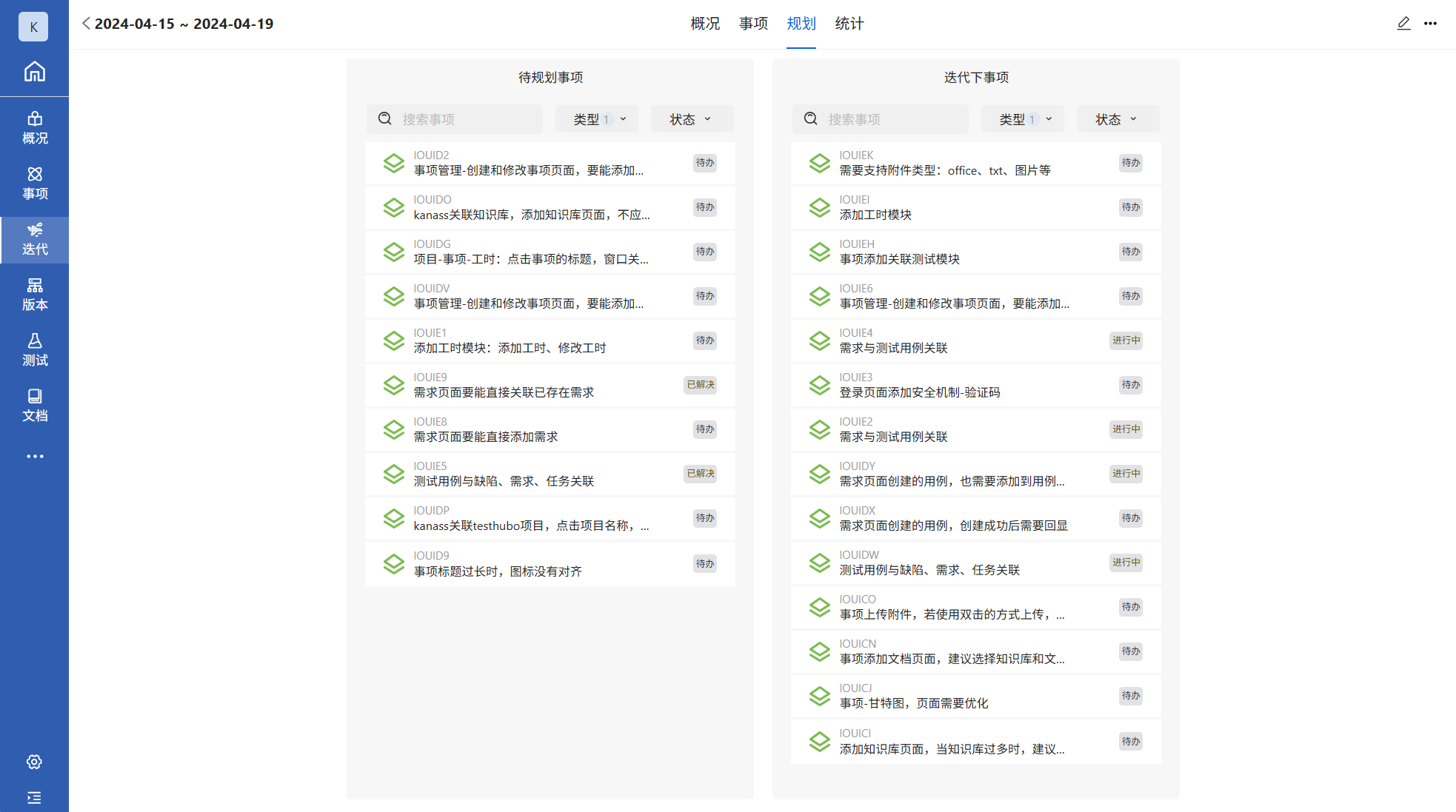 规划:在规划页面,可以看到待规划事项和当前迭代下事项。并支持使用拖拽方式快速规划事项。
