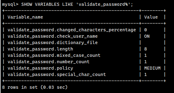 SHOW VARIABLES LIKE 'validate_password%';