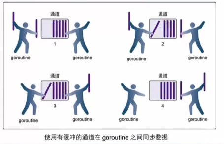 - 第 3 步,左侧的goroutine 还在向通道发送新值,而右侧的 goroutine 正在从通道接收另外一个值。这个步骤里的两个操作既不是同步的,也不会互相阻塞。