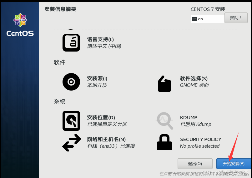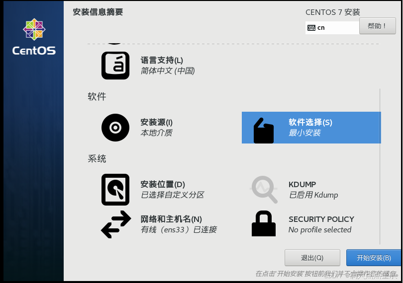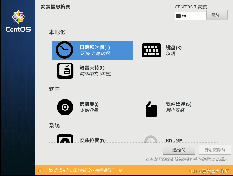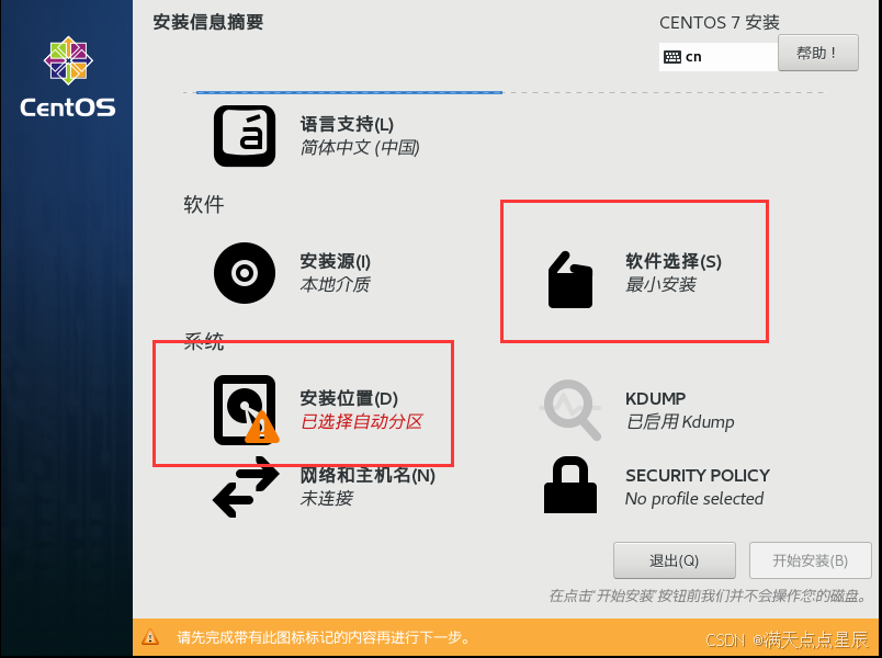 该页面最主要的是软件安装的选择、系统的安装位置、网络配置和主机名称的配置。如下图所示: