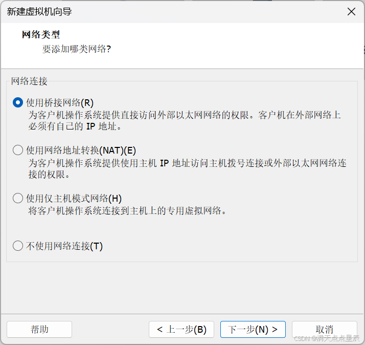 我这里选择了桥接模式。大家可以根据自已的实际情况进行选择即可。