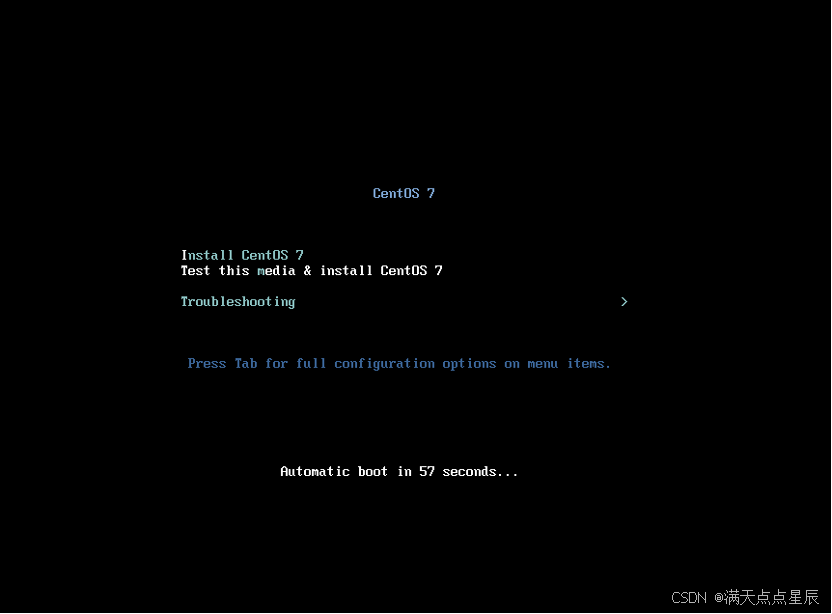 点击“开启此虚拟机”之后,会进入到安装Centos7的安装界面。如下图所示: