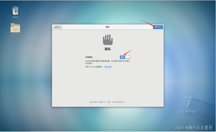 位置服务选择,可根据实际情况进行“打开”或“关闭”,最后点击“前进”。如下图所示: