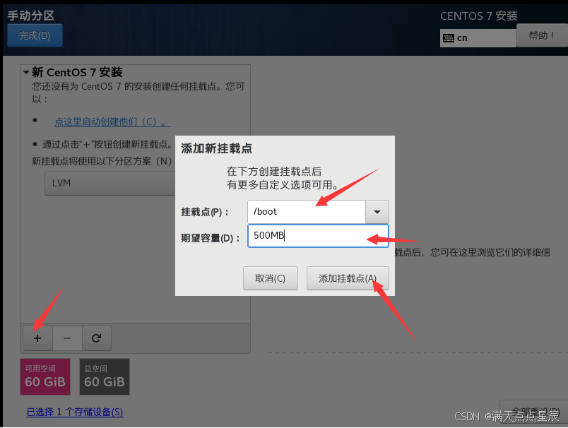 点击“+”,选择/boot分我,并给boot分区分500MB。最后点击“添加挂载点”。