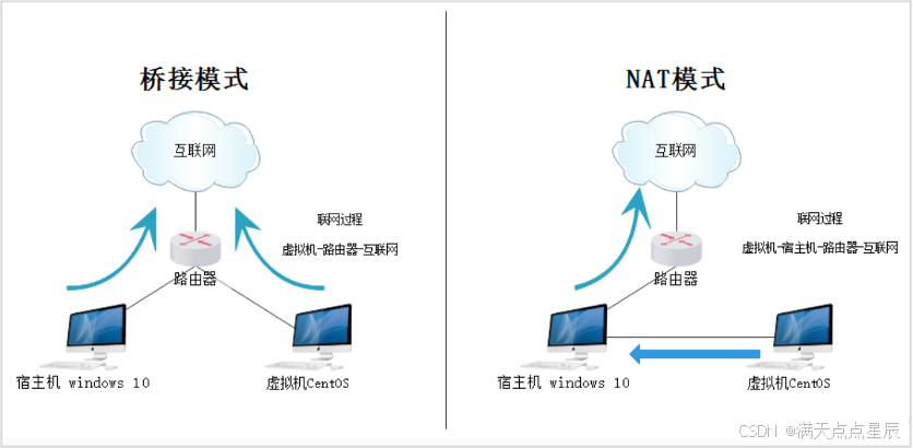 NAT:NAT模式就是虚拟机要联网得先通过宿主机才能和外面进行通信。