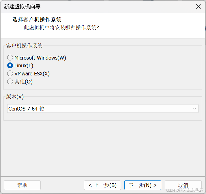 这里选择之后安装的操作系统,正确的选择会让VMtools有更好的兼容,这里选择Linux下的CentOS。也可以根据你所安装的操作系统去选对,如果是安装Windows,就选择“Microsoft Windows(W)”,依此类推,点击“下一步”