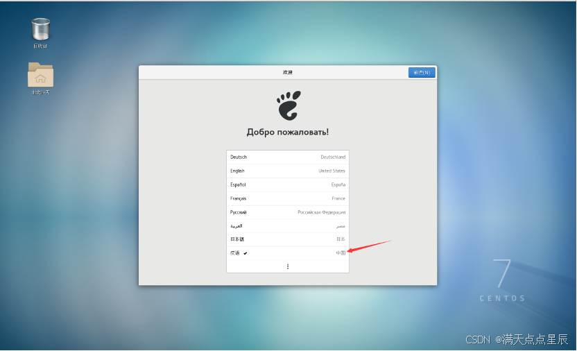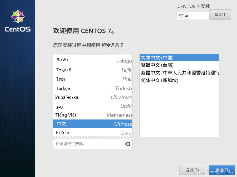 Centos7操作系统安装过程中的语言选择,选择“中文”或是“English”都可以,个人建议新手选择地“中文”这样可以不用翻译熟悉每个安装过程。