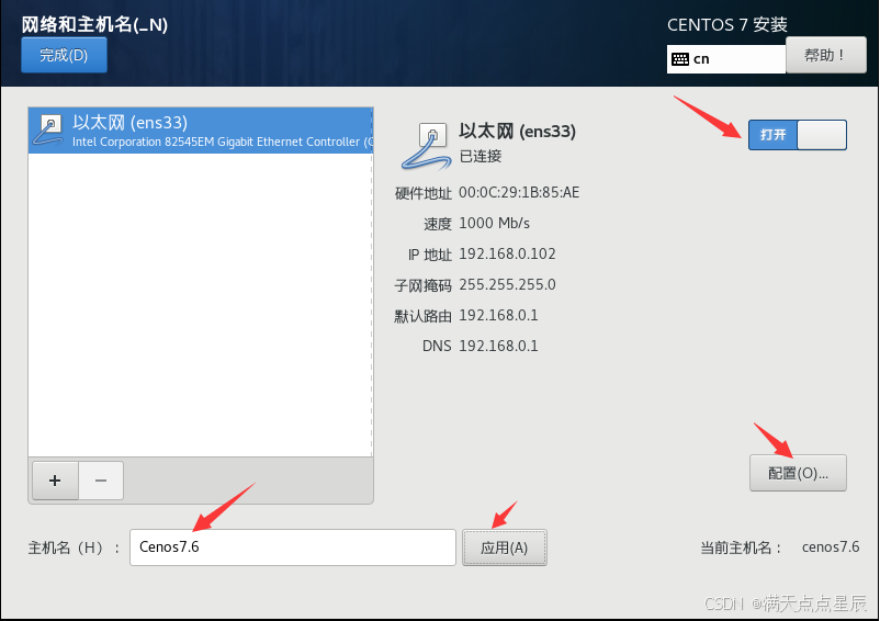根据自己实际情况,给主机名进行命令,命令之后进行应用和以太网的IP配置,此处的IP配置,我默认以DHCP分配来执行,如果大家不想使用DHCP自动分配,可以点击“配置”进行配置即可。