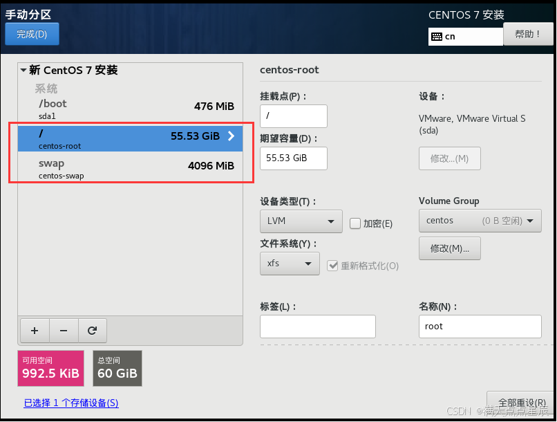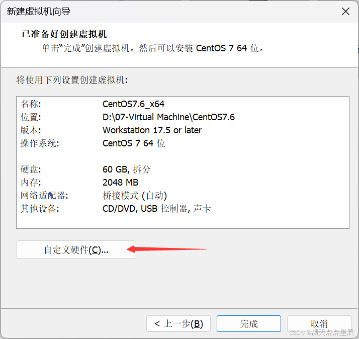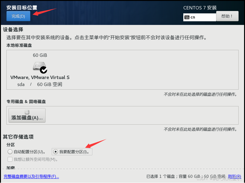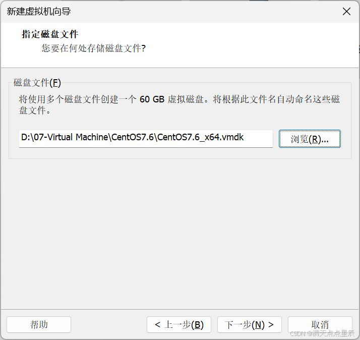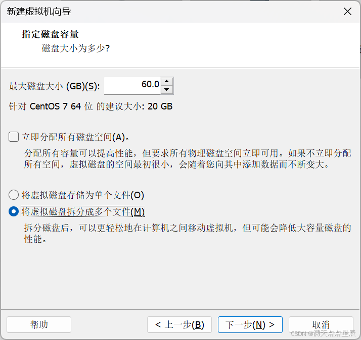 不要勾选立即分配所有磁盘,否则虚拟机会将60G直接分配给CentOS,会导致宿主机所剩硬盘容量减少。