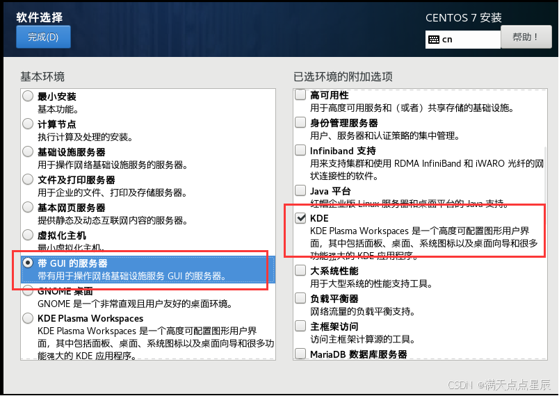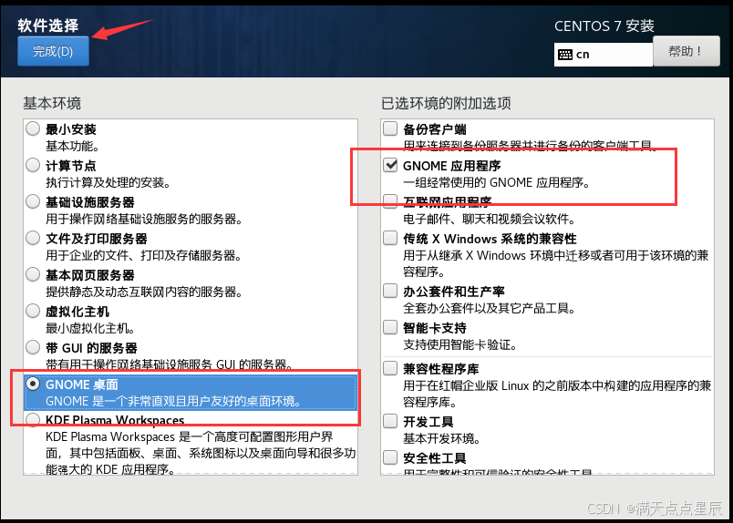 选择“带GUI的服务器”下的“KDE”,以及“GNOME桌面”下的“GNOME应和程序”。如下图所示: