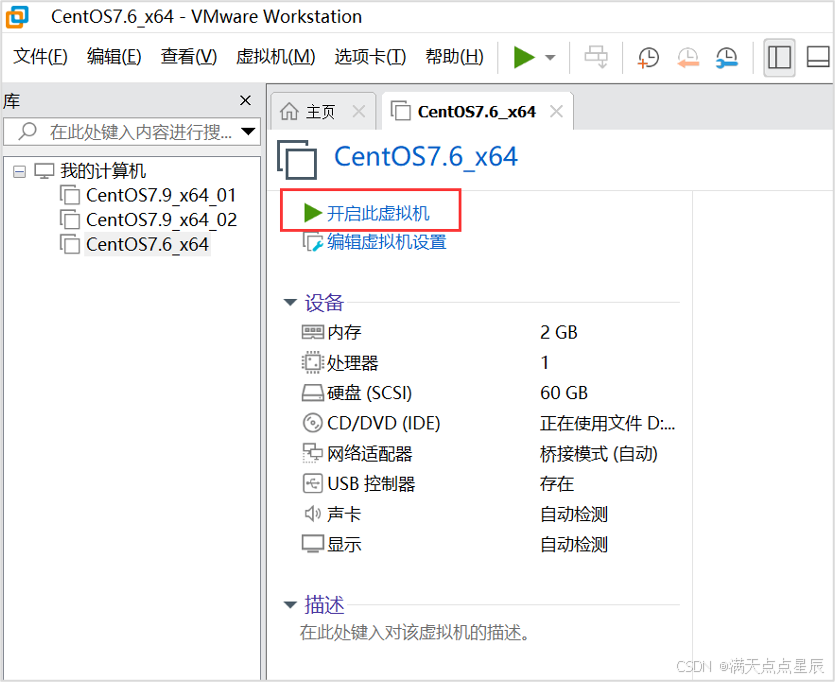 “确定”之后,点击“开启此虚拟机”。如下图所示: