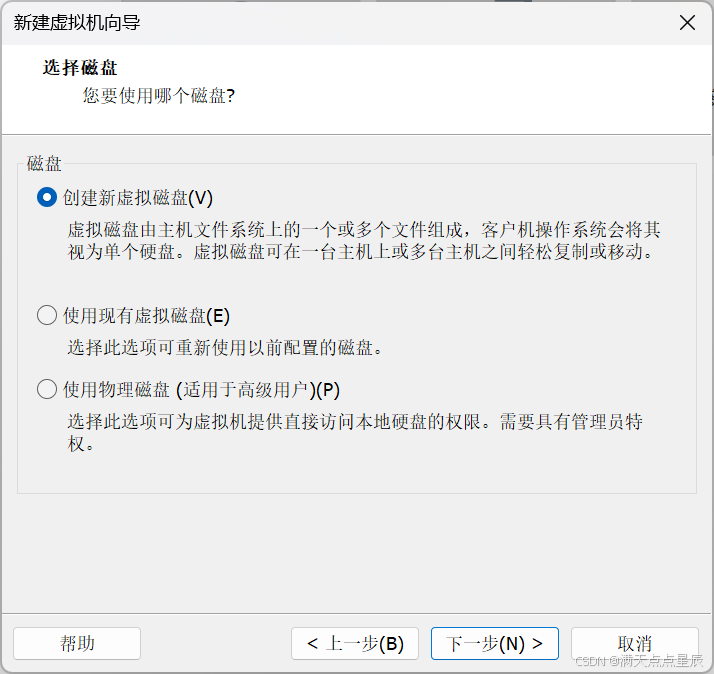 创建磁盘,按默认选择即可(如果之前创建好的可以选择“使用现有虚拟磁盘”)。点击“下一步”