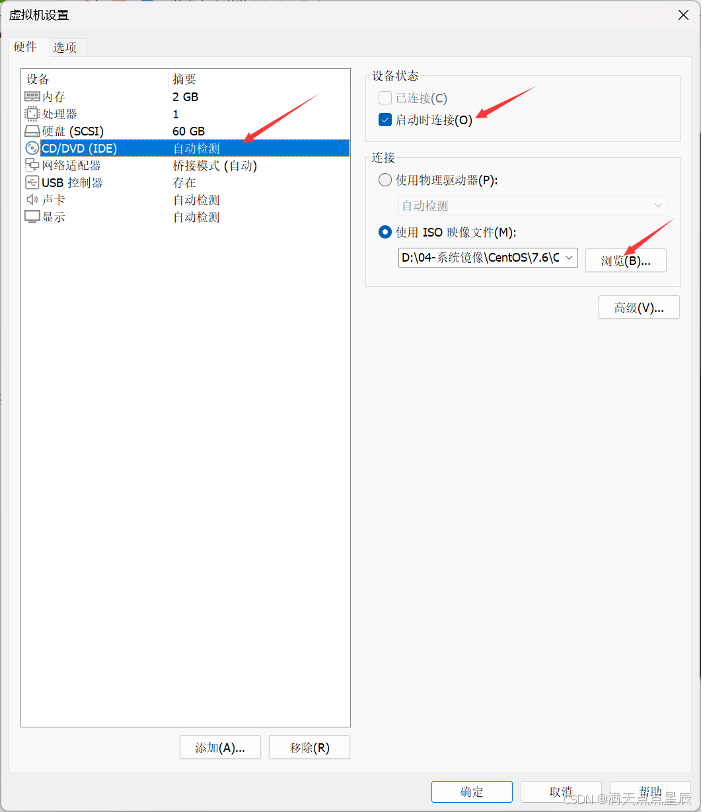 先选择CD/DVD,再选择使用ISO映像文件,最后选择“浏览”找到下载好的镜像文件。