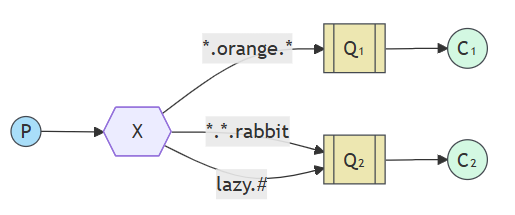 一个生产者,一个 topic 类型的交换机,多个队列,交换机与队列之间通过 routing-key 进行关联绑定,多个消费者。生产者发送消息到交换机并且要指定 routing-key,然后消息根据这交换机与队列之间的 routing-key 绑定规则进行路由被指定消费者消费。与路由模式不同是 routing-key 有指定的队则,可以更加的通用,满足更过的场景。routing-key 的规则如下: