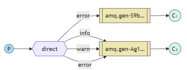 一个生产者,一个 direct 类型的交换机,多个队列,交换机与队列之间通过 routing-key 进行关联绑定,多个消费者。生产者发送消息到交换机并且要指定routing-key,然后消息根据这交换机与队列之间的 routing-key 绑定规则进行路由被指定消费者消费。