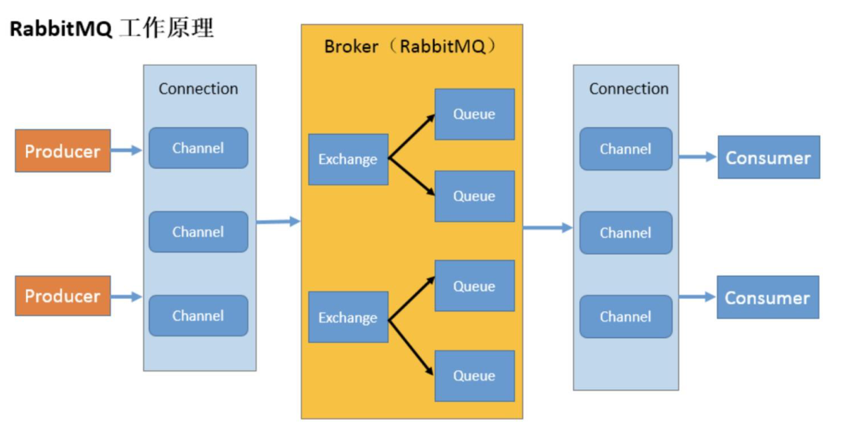 如上图所示,RabbitMQ 由 Producer、Broker、Consumer 三个大模块组成。生产者将数据发送到 Broker,Broker 接收到数据后,将数据存储到对应的 Queue 里面,消费者从不同的 Queue 消费数据。