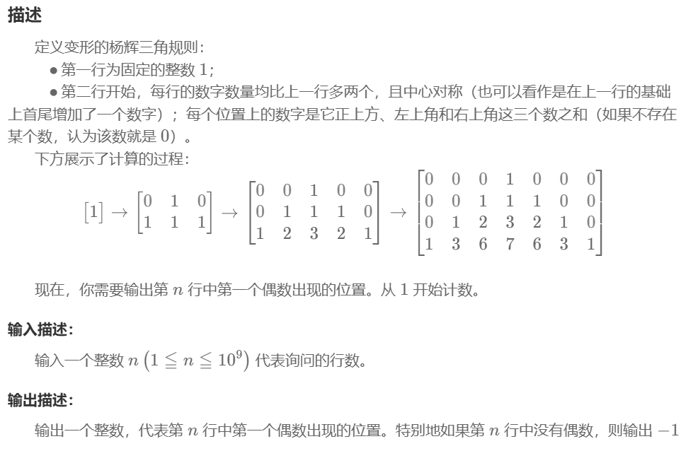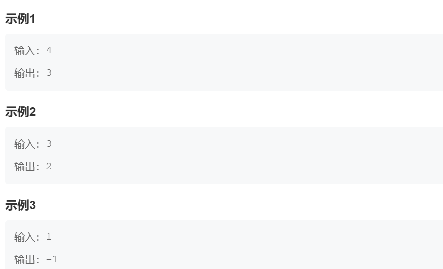 public static void main(String[] args) {Scanner sc = new Scanner(System.in);int n = sc.nextInt();if (n == 1 || n == 2) {System.out.println(-1);} else if (n % 2 == 1) {// 奇数行,第一个偶数位置是 2System.out.println(2);} else {// 偶数行if (n % 4 == 0) {System.out.println(3);} else {System.out.println(4);}}}