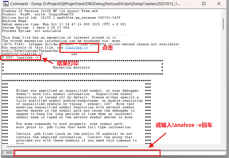 {//初始化dump文件夹QString logFilePath = QCoreApplication::applicationDirPath() + "/DumpCrashes/";QDir dstDir(logFilePath);if(!dstDir.exists()){if(!dstDir.mkpath(logFilePath)){qDebug()<<__FILE__<<__LINE__<<"创建DumpCrashes文件夹失败!";}}//创建Dump文件QString dumpFileName = logFilePath + QDateTime::currentDateTime().toString("yyyyMMdd_hhmmss") + ".dmp";HANDLE hDumpFile = CreateFile((LPCWSTR)(dumpFileName.toStdWString().c_str()), GENERIC_WRITE, 0, NULL, CREATE_ALWAYS, FILE_ATTRIBUTE_NORMAL, NULL);if(hDumpFile != INVALID_HANDLE_VALUE){//Dump信息MINIDUMP_EXCEPTION_INFORMATION dumpInfo;dumpInfo.ExceptionPointers = pException;dumpInfo.ThreadId = GetCurrentThreadId();dumpInfo.ClientPointers = TRUE;//写入Dump文件内容MiniDumpWriteDump(GetCurrentProcess(), GetCurrentProcessId(), hDumpFile, (MINIDUMP_TYPE)(MiniDumpWithDataSegs | MiniDumpWithProcessThreadData | MiniDumpWithUnloadedModules), &dumpInfo, NULL, NULL);}//这里弹出一个错误对话框并退出程序EXCEPTION_RECORD* record = pException->ExceptionRecord;QString errCode(QString::number(record->ExceptionCode,16));QString errAddr(QString::number((uint)record->ExceptionAddress,16));QMessageBox::critical(NULL,"错误",QString("程序异常崩溃捕获!\nerrCode:%1 \nerrAddr:%2").arg(errCode.toStdString().c_str()).arg(errAddr.toStdString().c_str()));return EXCEPTION_EXECUTE_HANDLER;