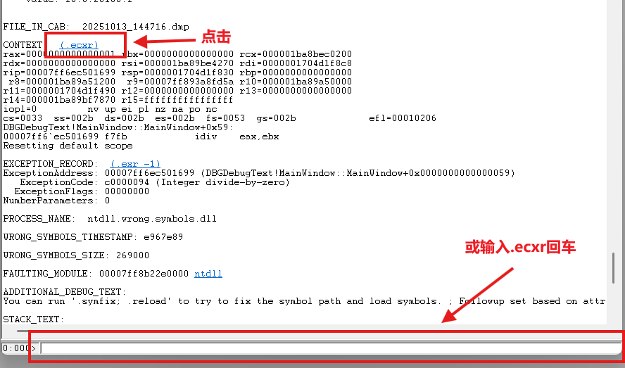 点击或在下方输入栏输入.excr 切换到发生异常的线程上下文中