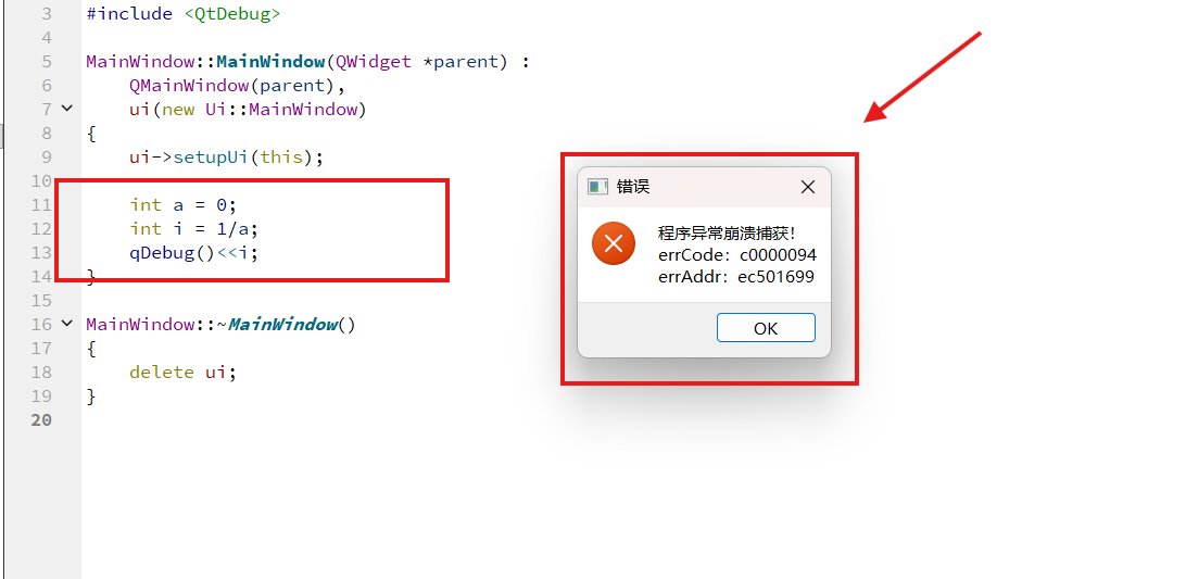 {QApplication a(argc, argv);//注冊异常捕获函数SetUnhandledExceptionFilter((LPTOP_LEVEL_EXCEPTION_FILTER)ApplicationCrashHandler); MainWindow w;w.show();return a.exec();