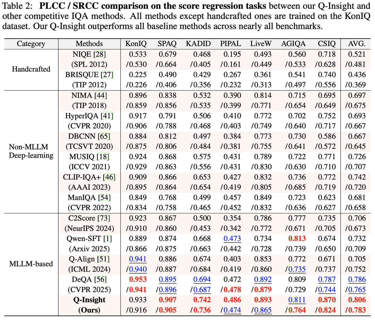 在图像质量评分任务上,Q-Insight在多个公开数据集上的表现均超过当前最先进的方法,特别是在域外数据上的泛化能力突出,并能够提供完整详细的推理过程。