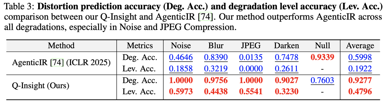 在退化感知任务上,Q-Insight的表现显著优于现有的退化感知模型,尤其是在噪声(Noise)和JPEG压缩退化类型识别的准确性上。