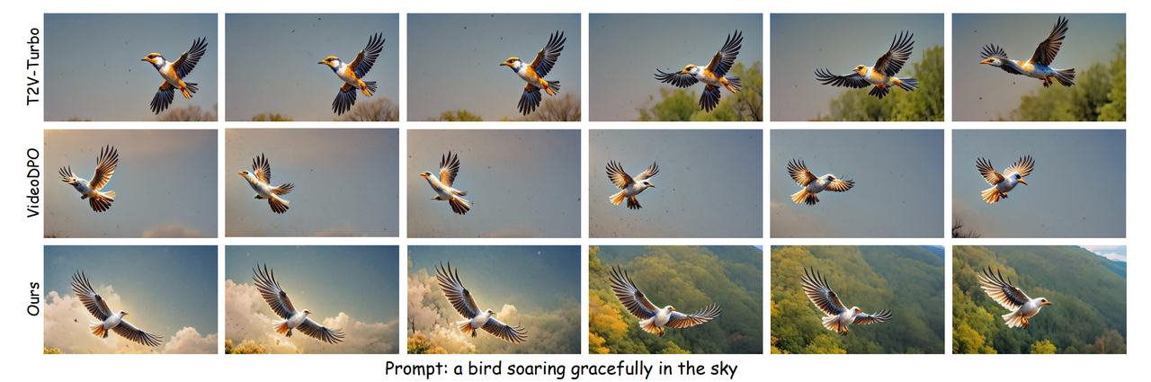 VQ-Insight强大的AIGC视频偏好比较能力,可直接应用于视频生成模型的直接偏好优化(DPO)。如图所示,基于VQ-Insight的方案相比于生成模型基线和对比方法,有效地缓解了错误生成的问题,并有着更鲜艳的色彩和动态。