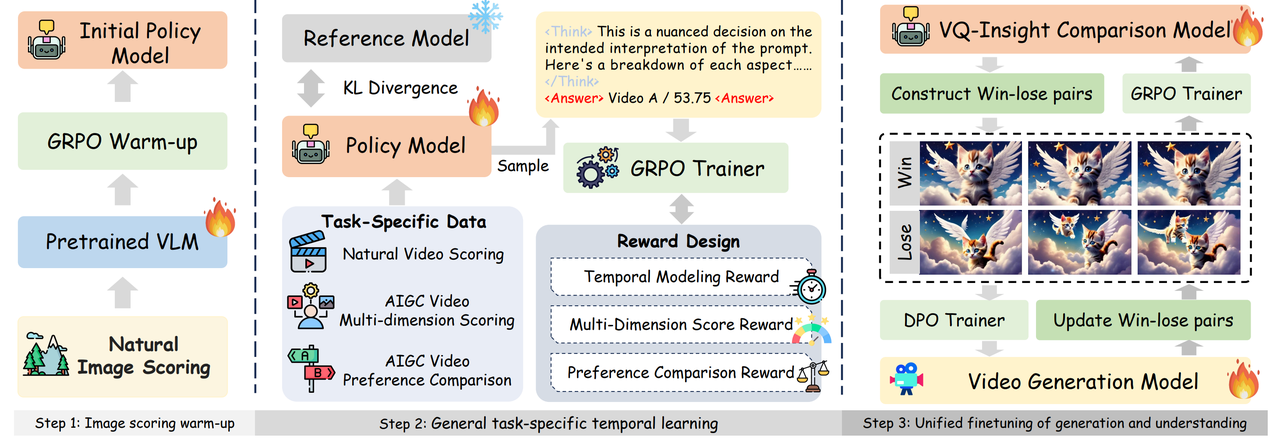 图像只捕捉视频的一个切片,用户真实的视频观看体验还取决于时间维度:运动是否自然?色彩是否在动态中稳定?因此,我们把 Q-Insight 的“推理式 + 强化学习”思路,拓展到自然视频和AIGC视频的评估和偏好比较中,提出了 VQ-Insight。