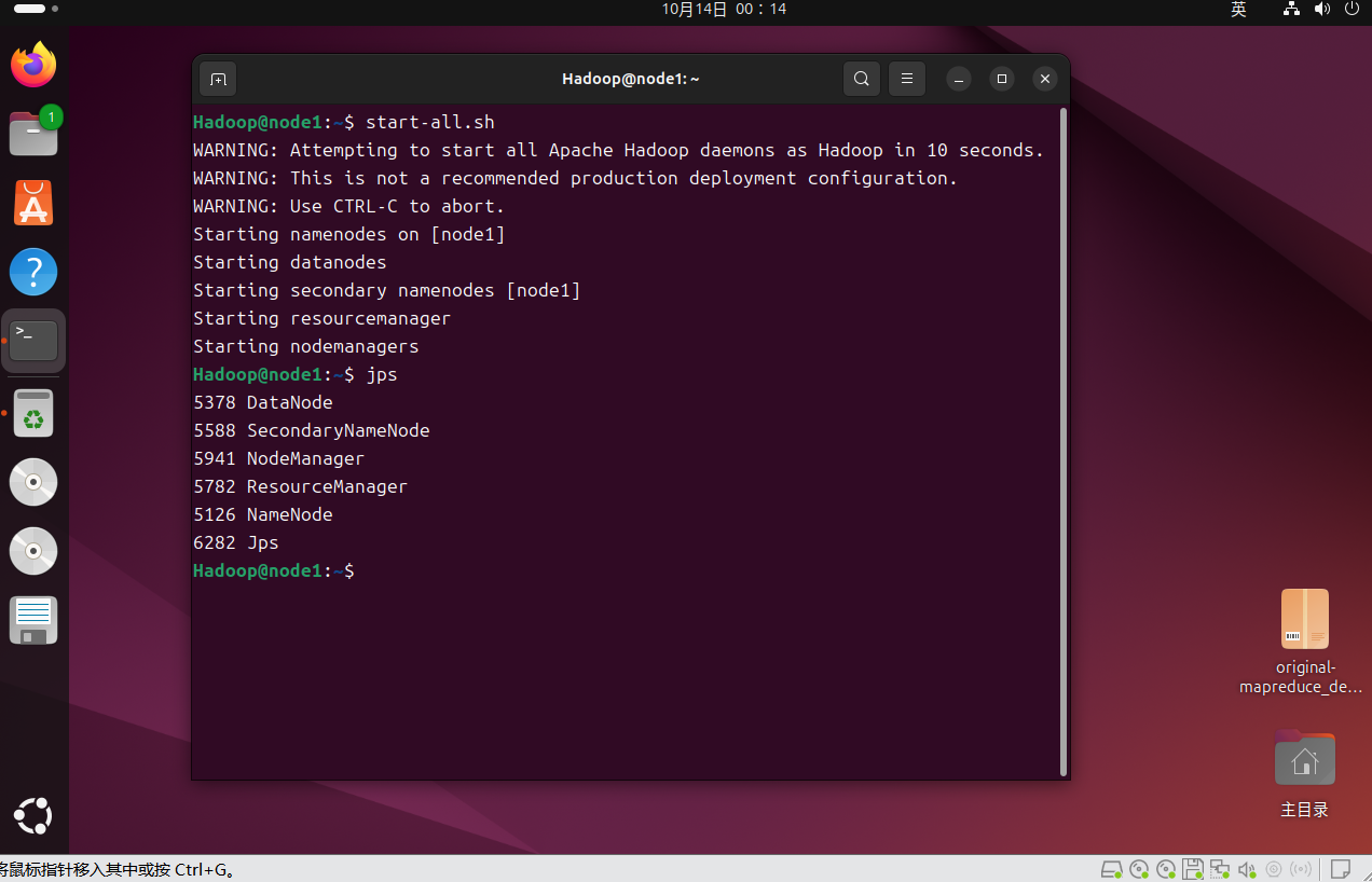 ①启动Hadoop 集群,通过jps命令验证,NameNode、DataNode、ResourceManager、NodeManager均正常启动: