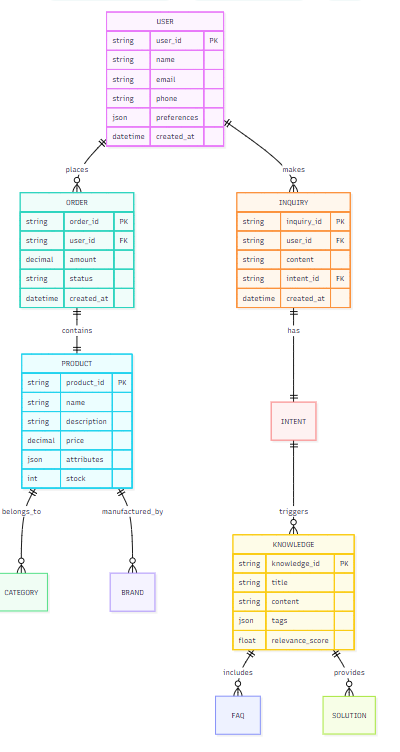 知识推荐系统的核心是构建完整的电商知识图谱,包含商品、用户、订单、服务等实体及其关系。