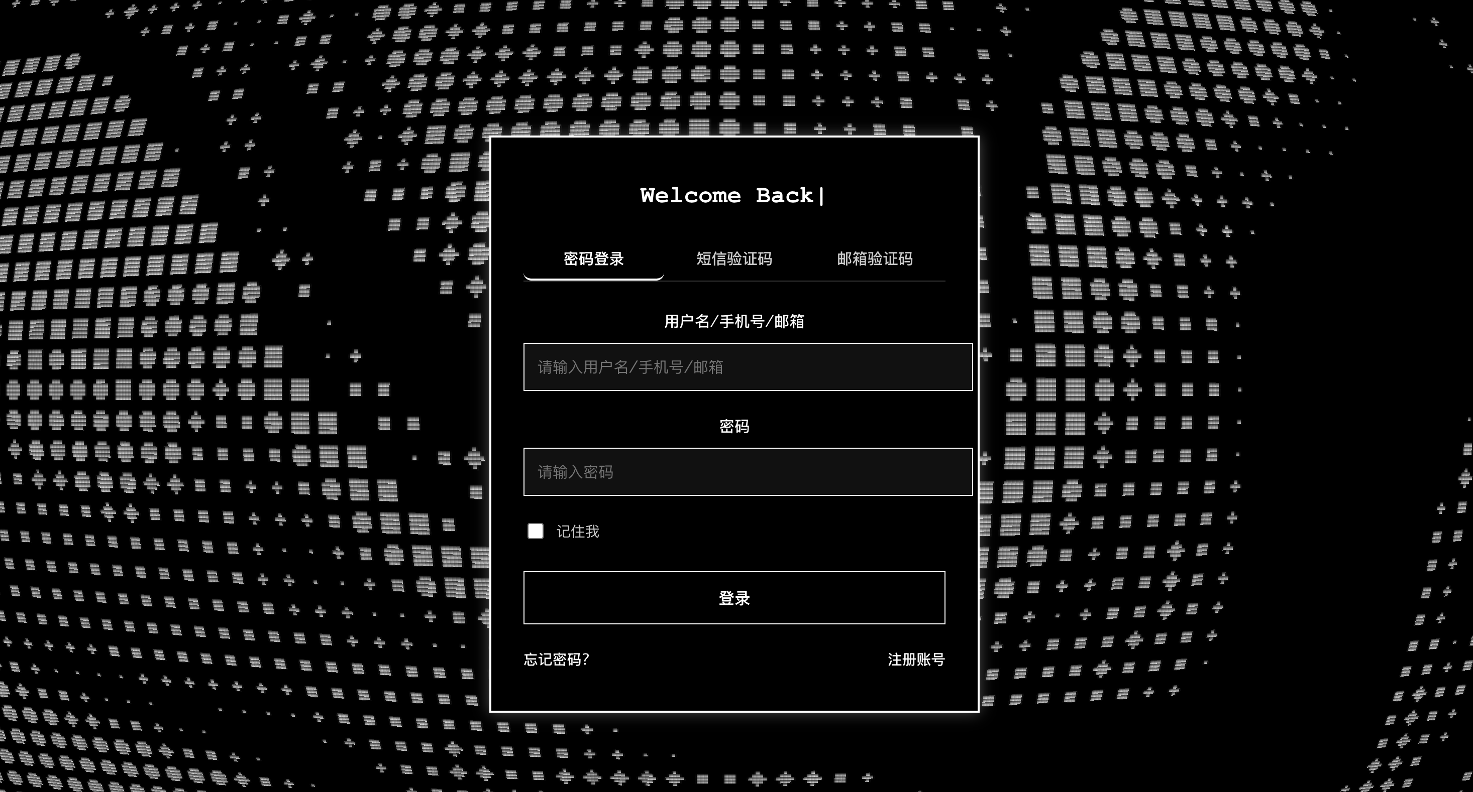 <div class="login-page"><div class="terminal-background"><FaultyTerminal:scale="1.5" :grid-mul="[2, 1]" :digit-size="1.5" :time-scale="0.3" :scanline-intensity="0.3" :glitch-amount="1" :flicker-amount="1" :noise-amp="1" :curvature="0.2" tint="#ffffff" :mouse-react="true" :mouse-strength="0.2" :page-load-animation="true" :brightness="0.8" style="width: 100%; height: 100%;" /></div>