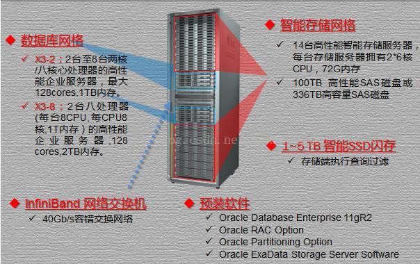 如果你购买1套全配置的Exadata,那么你将会得到一个机架,这个机架上包含八台台数据库服务器、14个Exadata存储服务器和三台InfiniBand交换机。