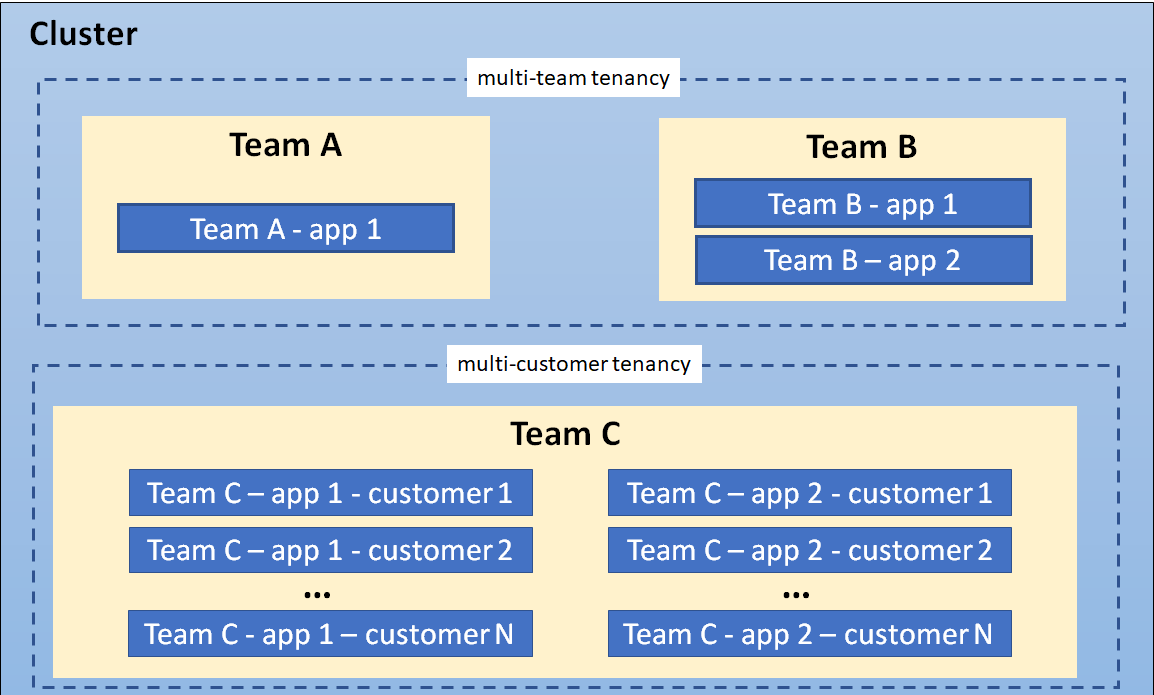 在多团队使用中,租户通常是一个团队, 每个团队部署少量工作负载,这些工作负载会随着用量而发生伸缩。 然而,“团队”的定义本身可能是模糊的, 因为团队可能被组织成更高级别的部门或细分为更小的团队。