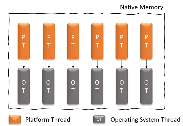 在Java中,每个Platform Thread(平台线程) 1:1 对应系统线程,默认情况下,jvm 分配给每个平台线程的虚拟机栈的大小是1M。也就是说,一台8g内存的设备,全部的内存用来创建平台线程,最多也只能生成 8192 条线程,设备的资源迅速就耗尽了。