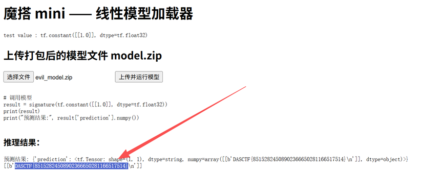 生成 evil_model.zip 文件,上传即可得到 flag