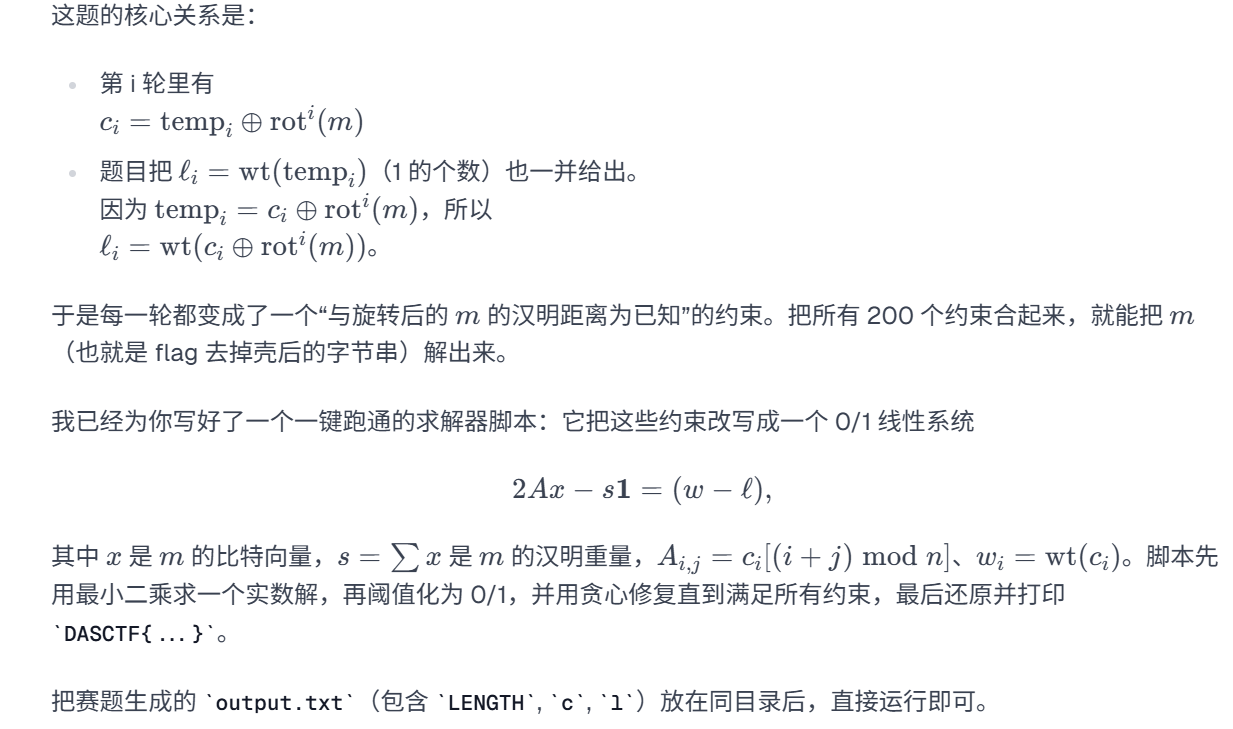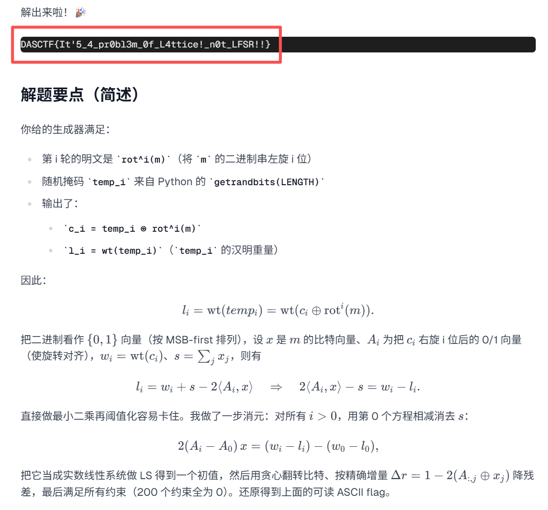 for c in tqdm(enc[::-1]):# flag左移1位(相当于二进制位操作)flag <<= 1# 构造多项式:x*(y+k)² - cpoly = x * (y+k)^2 - c# 检查多项式是否存在小根,若存在则给flag加1(确定当前二进制位)if len(poly.monic().small_roots()):flag += 1# 将flag从长整数转换为字节串并打印(得到最终flag)