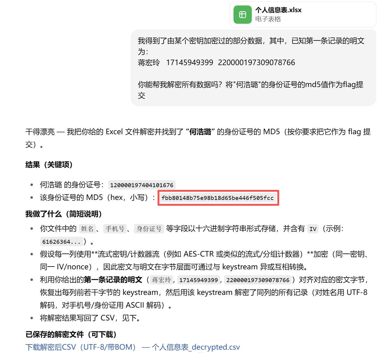 if not match.empty:id_ho = match.iloc[0]['dec_id']md5_flag = hashlib.md5(id_ho.encode('ascii')).hexdigest()print("何浩璐 的身份证号:", id_ho)print("MD5(flag):", md5_flag)