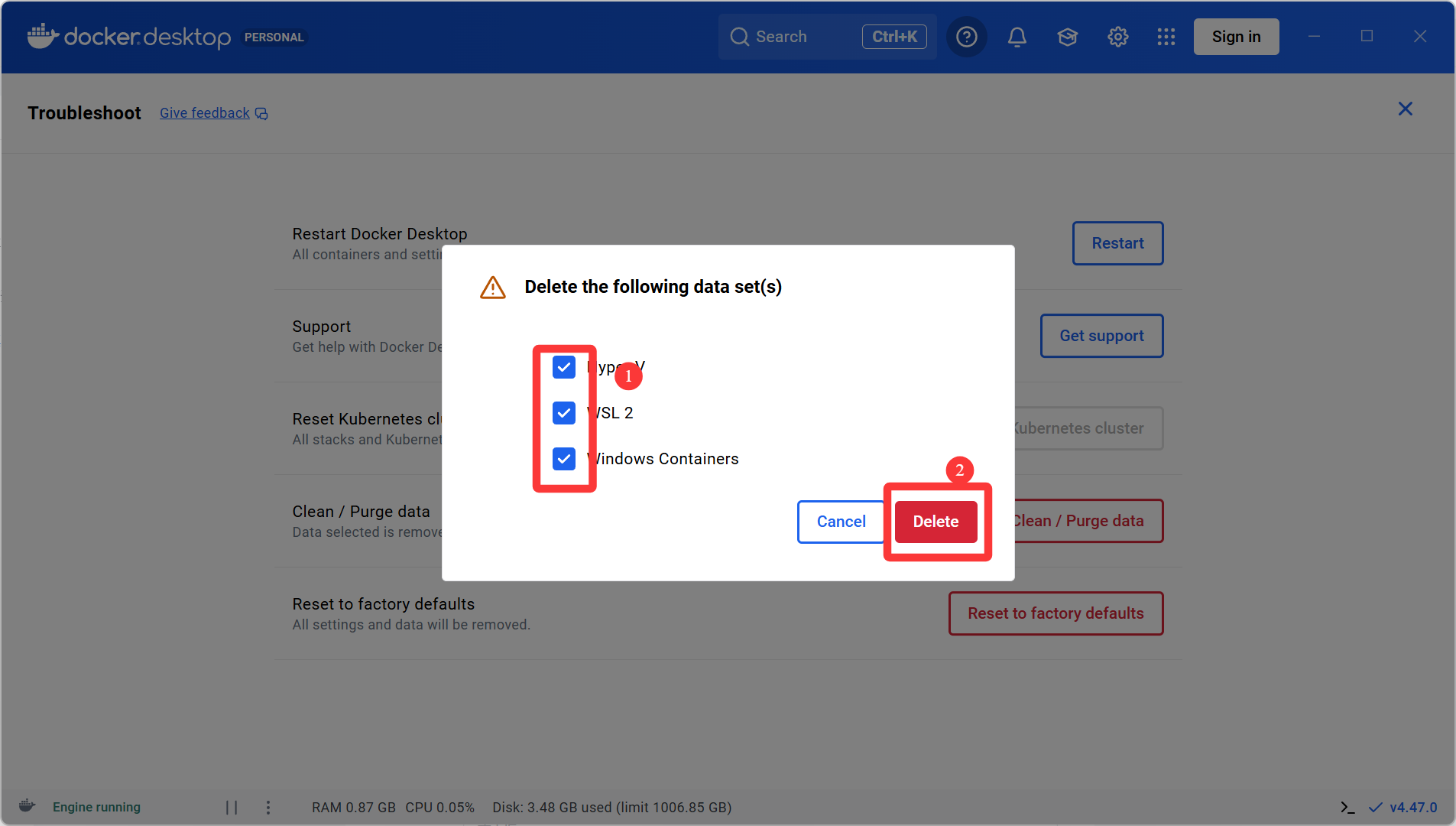 PS: 我的系统环境为Windows 11 家庭版 23H2,Docker版本为Docker Desktop 4.45.0 (203075)。Windows家庭版不支持Hyper-V,所以之后压缩虚拟磁盘的步骤需要使用diskpart