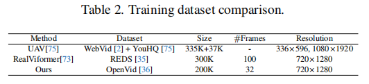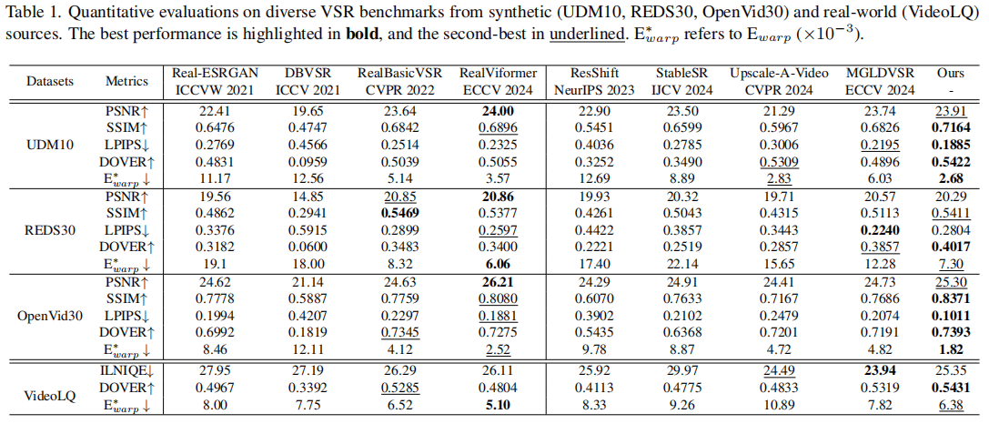 - 合成数据集:UDM10、REDS30、OpenVid30