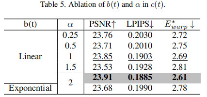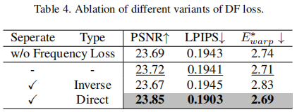 分离频率成分并采用“direct”加权(早期重低频,后期重高频)效果最好,PSNR和LPIPS均提升。