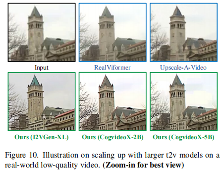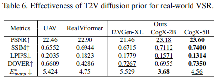 使用更大的T2V模型(如CogVideoX-5B)能进一步提升性能,SSIM从0.6944升至0.7400,DOVER从0.6609升至0.7350,验证了缩放定律(scaling law) 在VSR中的有效性。